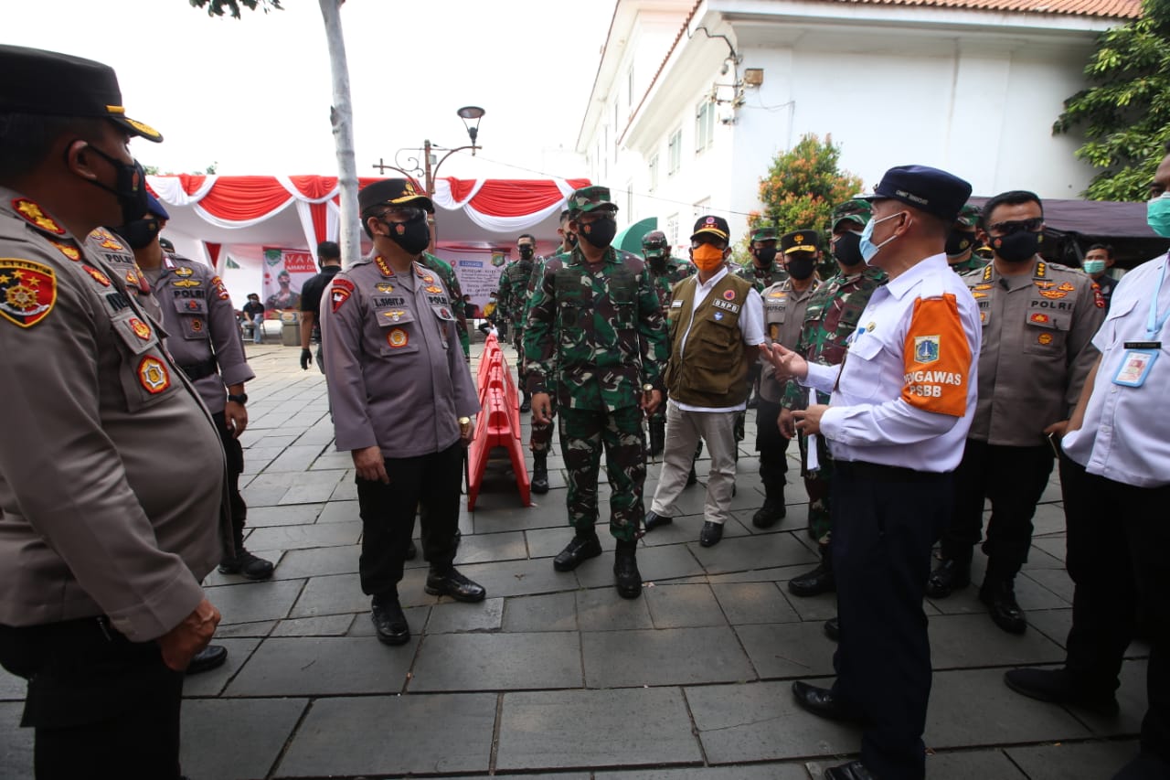 Jakarta, MLN – Panglima TNI Marsekal Hadi Tjahjanto dan Kapolri Jenderal Listyo Sigit Prabowo meninjau vaksinasi massal di Kota Tua, Jakarta Barat. Kegiatan vaksinasi massal ini diselenggarakan Polsek Metro Tamansari bekerjasama dengan Koramil 01 Tamansari sejak tanggal 5 hingga 9 Juli.