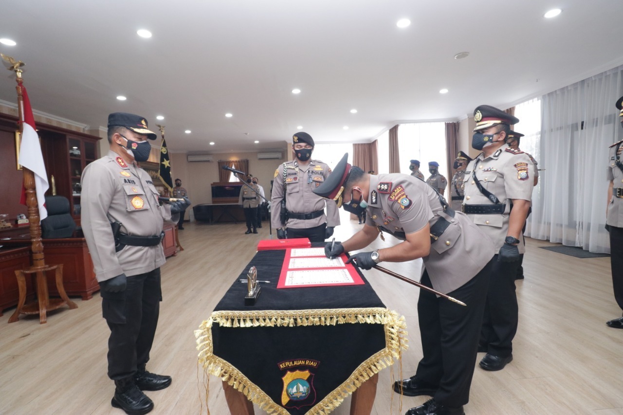 Kabid Humas Polda Kepri Kombes Pol Harry Goldenhardt S., S.IK., M.Si. mengatakan “Pelaksanaan Serah terima jabatan pada hari ini untuk menindaklanjuti Surat Telegram Kapolri Nomor : ST Kapolri Nomor : ST/1507/VII/KEP./2021, ST/1508/VII/KEP./2021, dan ST/1511/VII/KEP./2021 tanggal 26 Juli 2021. tentang Alih Tugas/mutasi jabatan Pejabat utama Polda Kepri. Di dalam surat Telegram tersebut Dirpolairud Polda Kepri Kombes Pol Giuseppe Reinhard Gultom, S.I.K., diangkat dalam jabatan baru sebagai Dirpolairud Polda Banten, digantikan oleh Akbp Marudut Liberti Panjaitan, S.I.K., M.H., yang sebelumnya menjabat sebagai Wadirpolairud Polda Kepri, Kapolres Bintan Polda Kepri Akbp Bambang Sugihartono, S.I.K., M.M., diangkat dalam jabatan baru sebagai Kabagdalpers Ro SDM Polda Kaltim digantikan oleh Akbp Tidar Wulung Dahono, S.H., S.I.K., M.H., yang sebelumnya menjabat sebagai Kasubdit 1 Ditreskrimsus Polda Kepri, Kapolres Karimun Polda Kepri Akbp Dr. Muhammad Adenan As, S.H., S.I.K., M.H., diangkat dalam jabatan baru sebagai Kabagbinkar Ro SDM Polda Sumut digantikan oleh Akbp Tony Pantano, S.I.K., S.H., yang sebelumnya menjabat sebagai Kasubdit 4 Ditreskrimsus Polda Kepri, Kapolres Kepulauan Anambas Polda Kepri Akbp Cakhyo Dipo Alam, S.I.K., diangkat dalam jabatan baru sebagai Wadirlantas Polda Kepri digantikan oleh Akbp Syafrudin Semidang Sakti, S.I.K., yang sebelumnya menjabat sebagai Kasubditregident Ditlantas Polda Kepri, dan Kabagpsi Ro SDM Polda Kepri Akbp Isti Rahayu, S.Pd., S.Psi., M.Psi., diangkat dalam jabatan baru sebagai Pamen Polda DIY”.