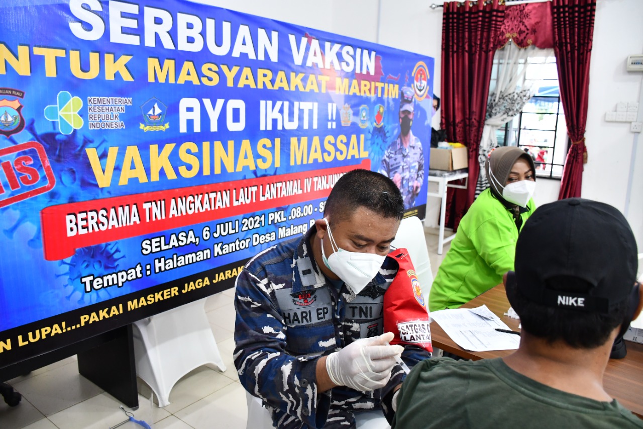 Bintan, MLN – Pangkalan Utama TNI Angkatan Laut IV (Lantamal IV) menggelar Serbuan Vaksin Covid-19 Untuk Masyarakat Maritim serentak diseluruh Indonesia kali ini dilaksanakan di Desa Malang Rapat Kecamatan Gunung Kijang Bintan Kepulauan Riau, Selasa pagi (06/7/2021)