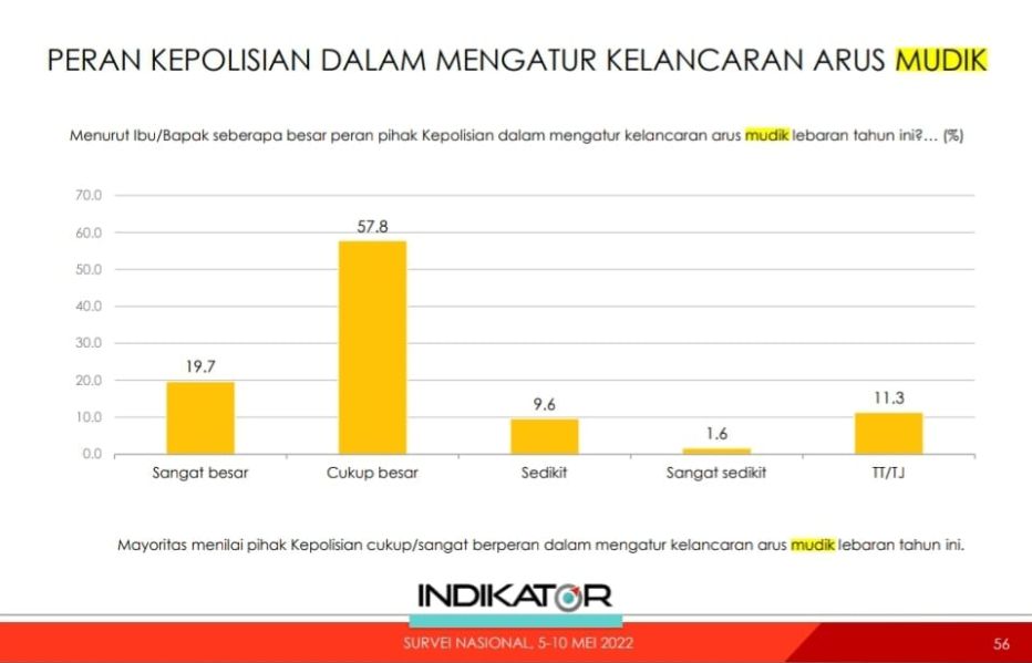 Dari hasil survei tersebut, sebanyak 19,7 persen masyarakat menyatakan bahwa kepolisian memiliki peran sangat besar dalam mengatur kelancaran arus mudik. Sementara, 57,8 persen menyebut cukup besar.