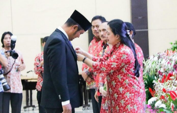 Lencana Manggala Karya Kencana 2018 dari Menteri Koordinator Bidang Pembangunan Manusia dan Kebudayaan Republik Indonesia Puan Maharani saat Puncak Hari Keluarga Nasional (HARGANAS) XXV tahun 2018 di Kediaman Gubernur Sulawesi Utara, Kota Manado, Jum’at malam (6/7/18).