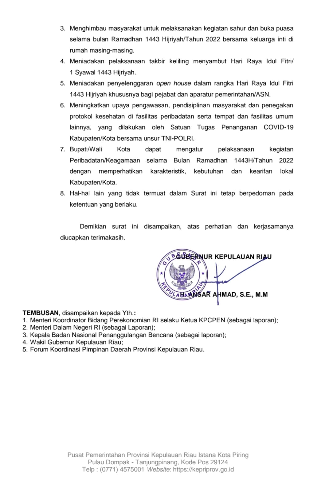 Gubernur Ansar berharap, surat tersebut dapat menjadi pedoman seluruh masyarakat Kepri dalam menjalankan ibadah selama Ramadhan 1443 H dengan tetap mendukung upaya pemerintah mengendalikan dan penghentian penyebaran Covid 19.