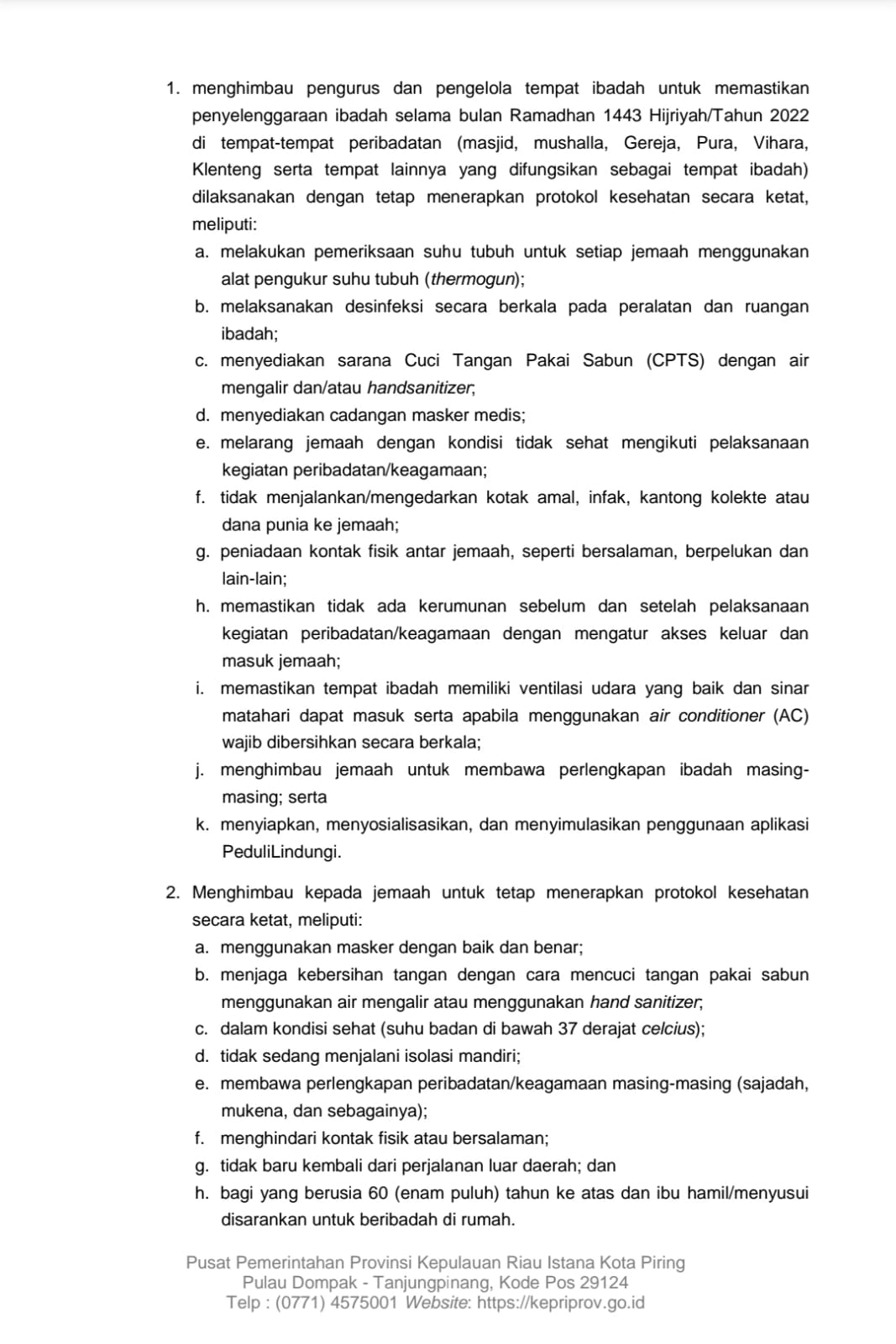Di dalam surat tersebut, Gubernur Ansar meminta para Bupati dan Walikota agar dapat menghimbau baik kepada pengurus dan pengelola tempat ibadah dan juga jamaah untuk memastikan penyelenggaraan ibadah selama bulan Ramadhan 1443 Hijriyah/Tahun 2022 di tempat-tempat peribadatan dilaksanakan dengan tetap menerapkan protokol kesehatan secara ketat.