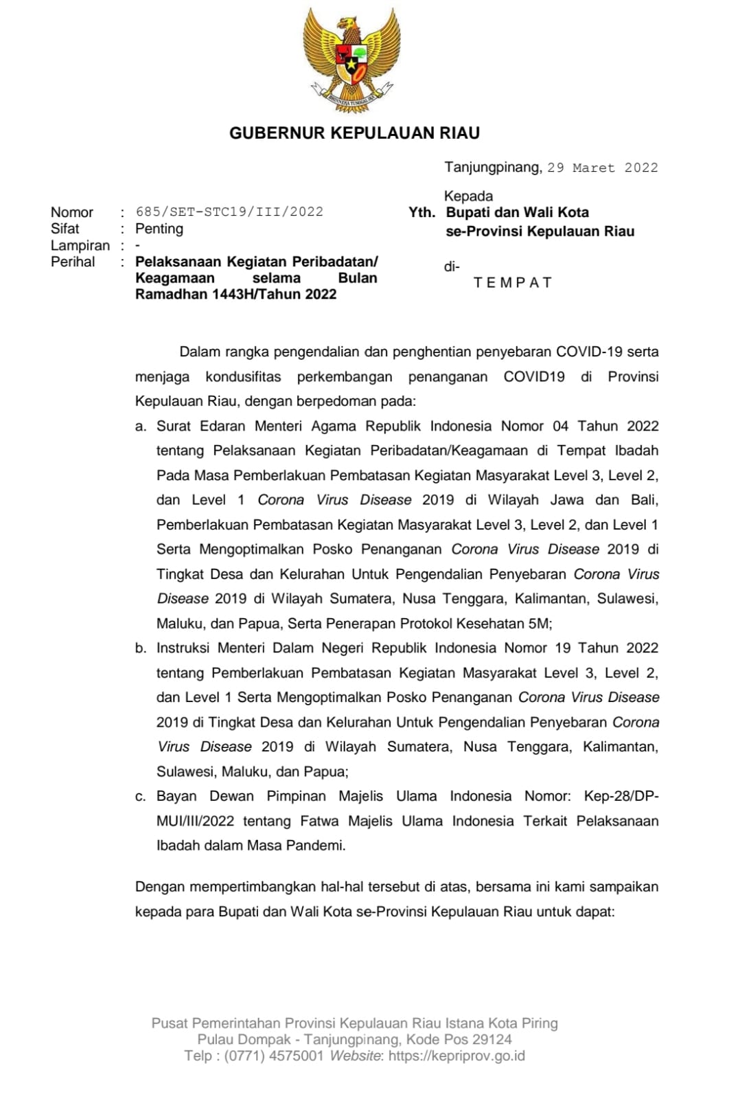 Surat tertanggal 29 Maret 2022 dengan nomor 685/SET-STC19/III/2022 tersebut mengatur tentang Pelaksanaan Kegiatan Peribadatan/Keagamaan selama Bulan Ramadhan 1443H/Tahun 2022 di Provinsi Kepri. Masyarakat diizinkan untuk menjalankan ibadah di rumah-rumah ibadah dengan tetap memperhatikan aturan di dalam surat tersebut.
