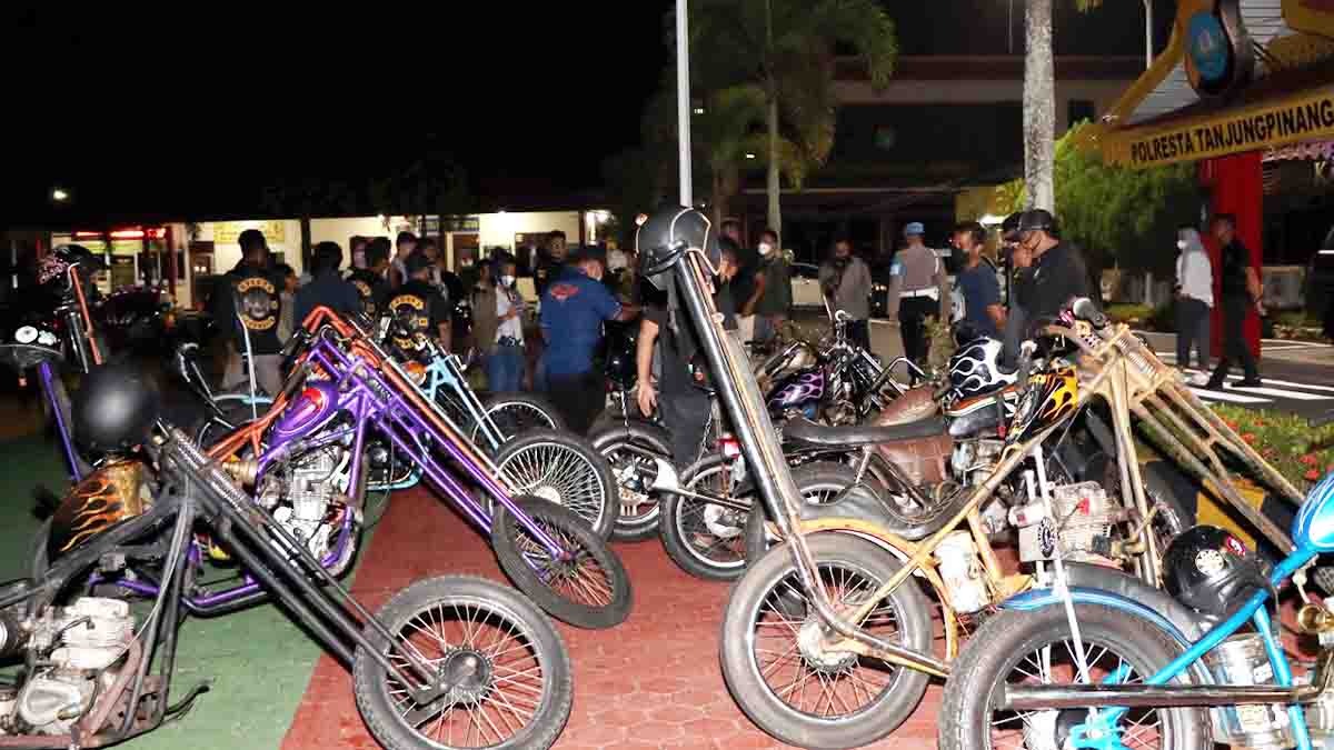Media Lintas Nusa – 2 (dua) unit kendaraan R4 (Mobil) dan 12 unit kendaraan R2 (Sepeda Motor) komunitas motor yang sudah dimodifikasi dan tidak standar ketentuan ditilang Satlantas Polres Tanjung Pinang pada Razia Cipta Kondisi dalam Kegiatan Rutin Yang Ditingkatkan (KRYD) di wilayah kota Tanjung Pinang, Sabtu, 28 Mei 2022 pukul 23.00 WIB.