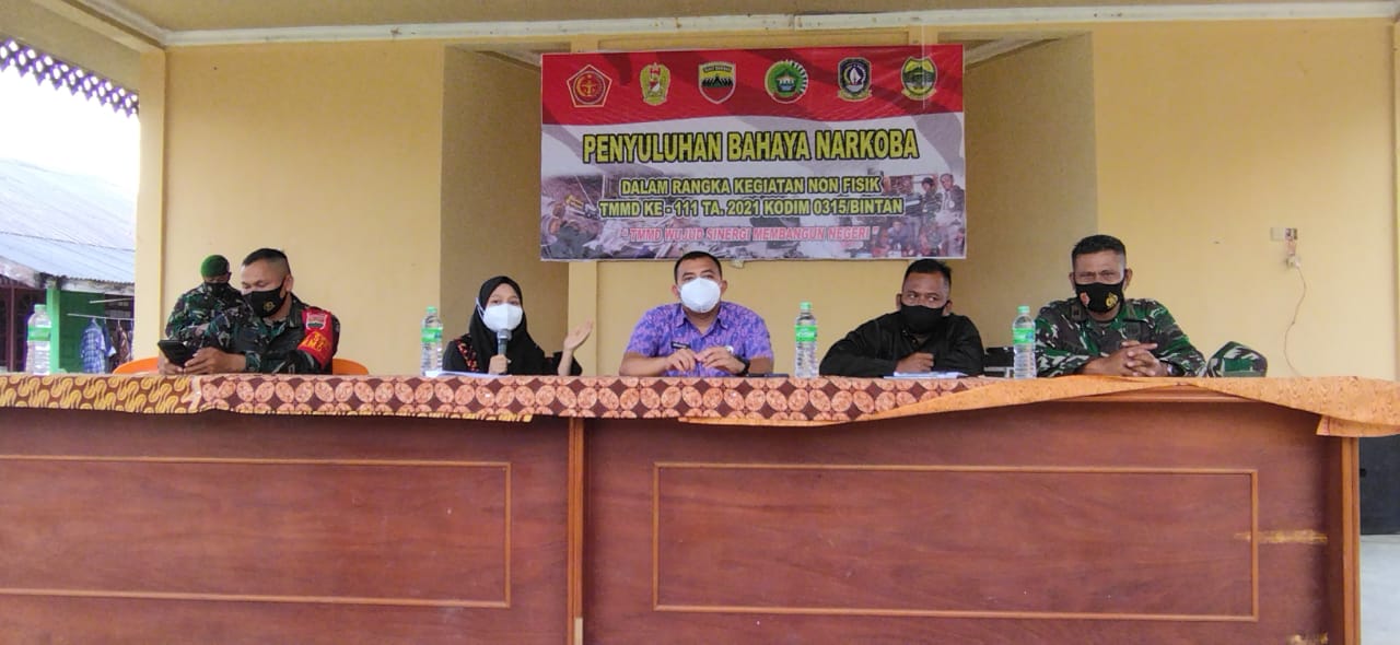 BINTAN, MLN – Satgas TMMD ke 111 Kodim 0315/Bintan Tahun 2021 menggelar penyuluhan tentang bahaya Narkoba kepada Warga Desa Marok Tua, Kecamatan Singkep Barat, Kabupaten Lingga, Minggu (11/7/2021).