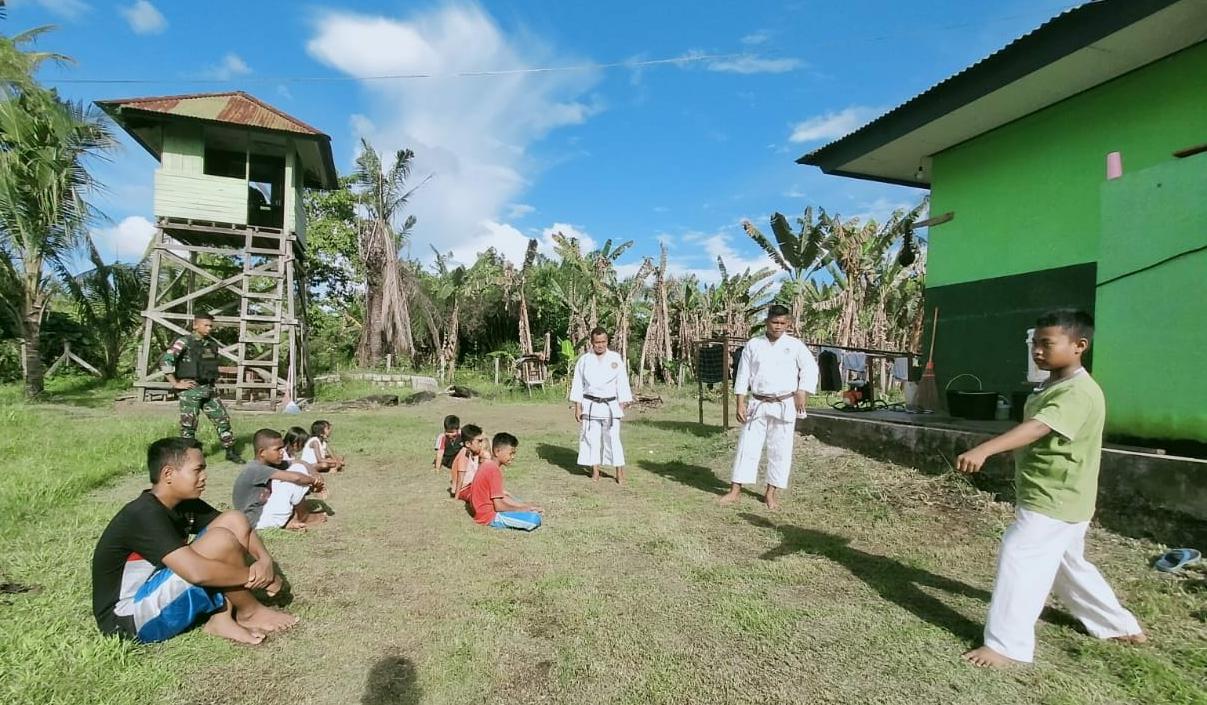 Keerom, MLN – Dalam rangka menciptakan generasi penerus bangsa yang memiliki jiwa ksatria, anggota Pos Kotis Satgas Pamtas RI-PNG Yonif Mekanis 512/QY melatih anak seni beladiri Karate di Pir IV Distrik Mannem, Kabupaten Keerom, Papua. Selasa (27/04/2021)